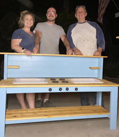 Our mud kitchens and outdoor toys are made of real wood. We hand craft them in California, home of the golden poppy!