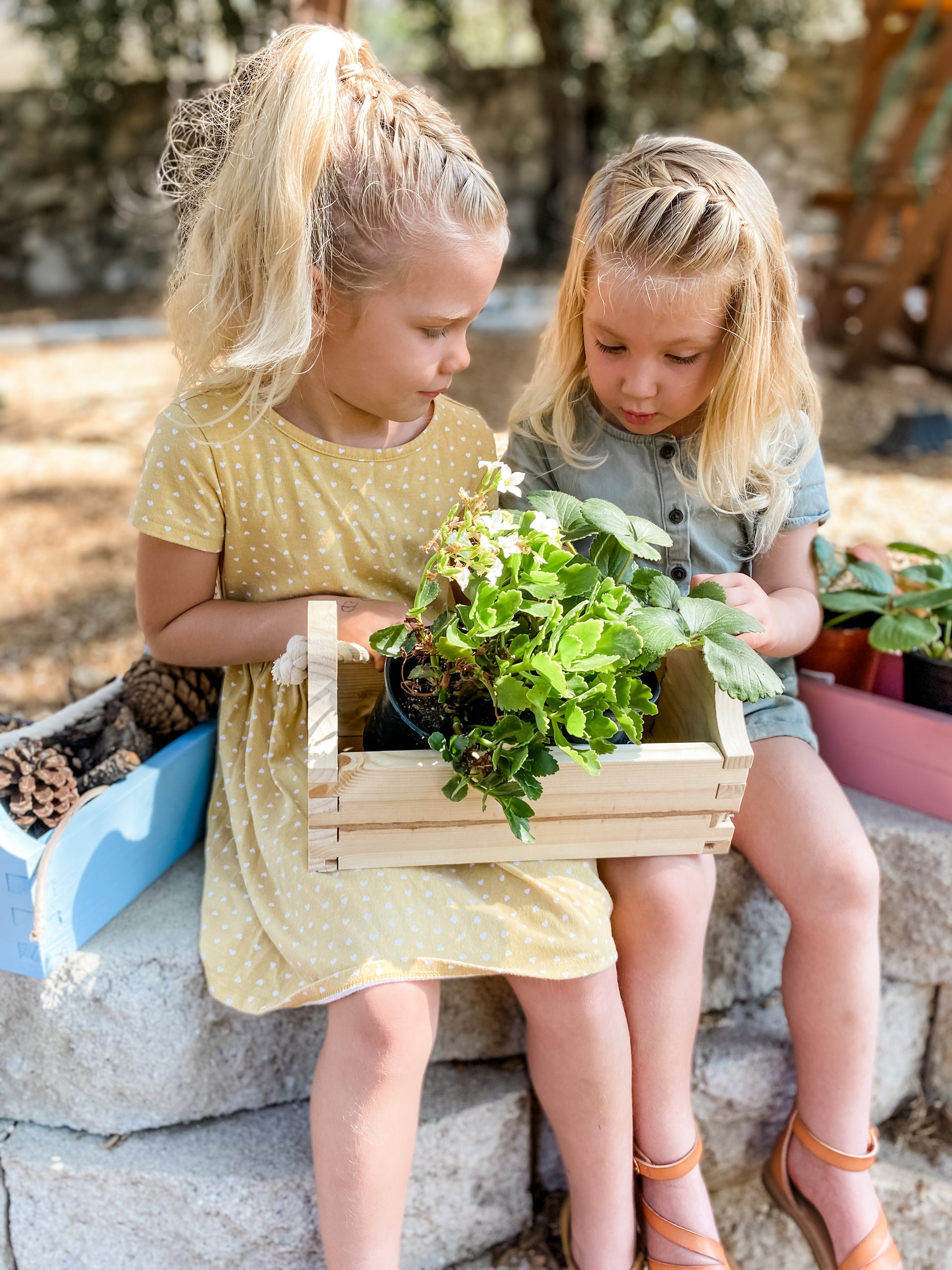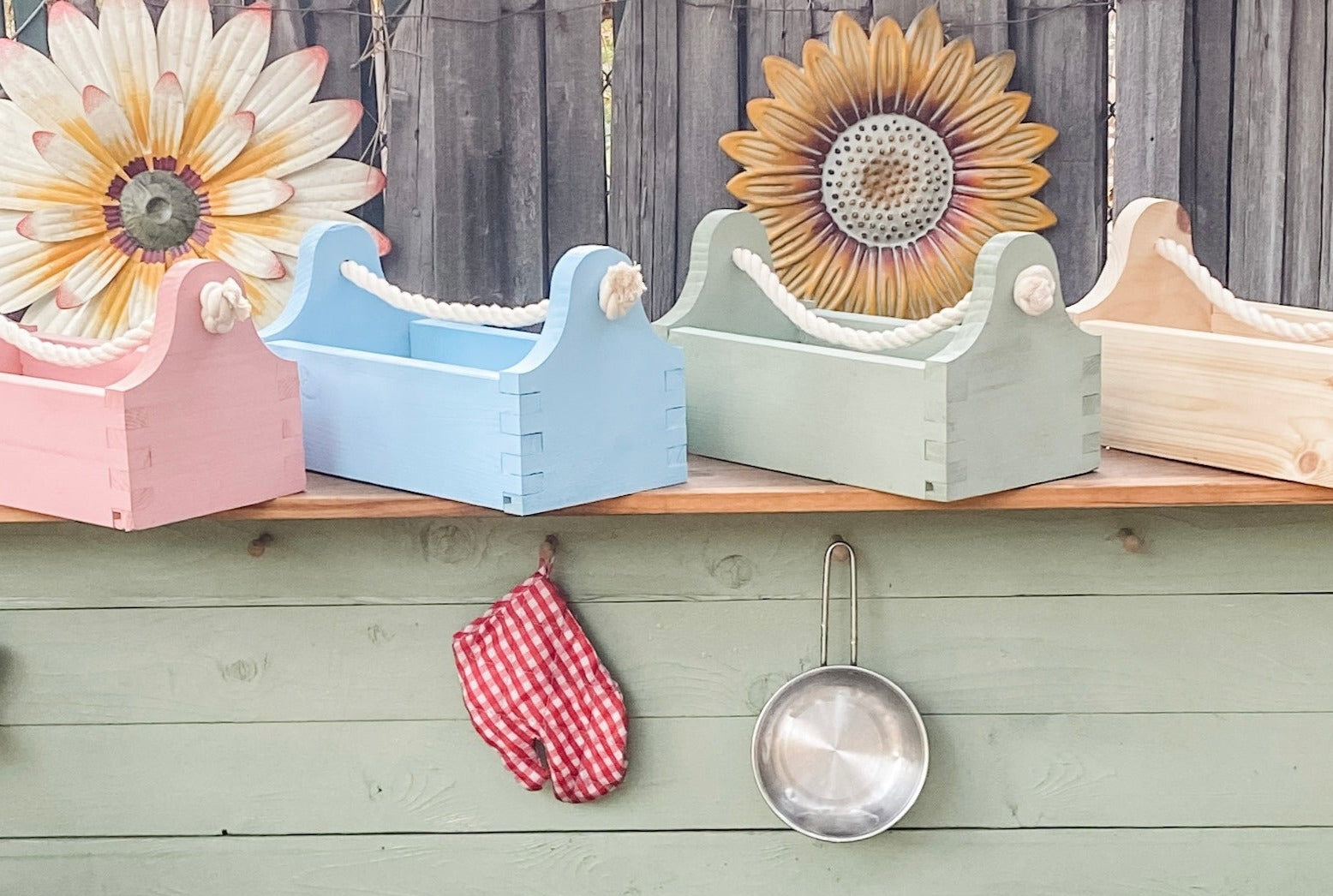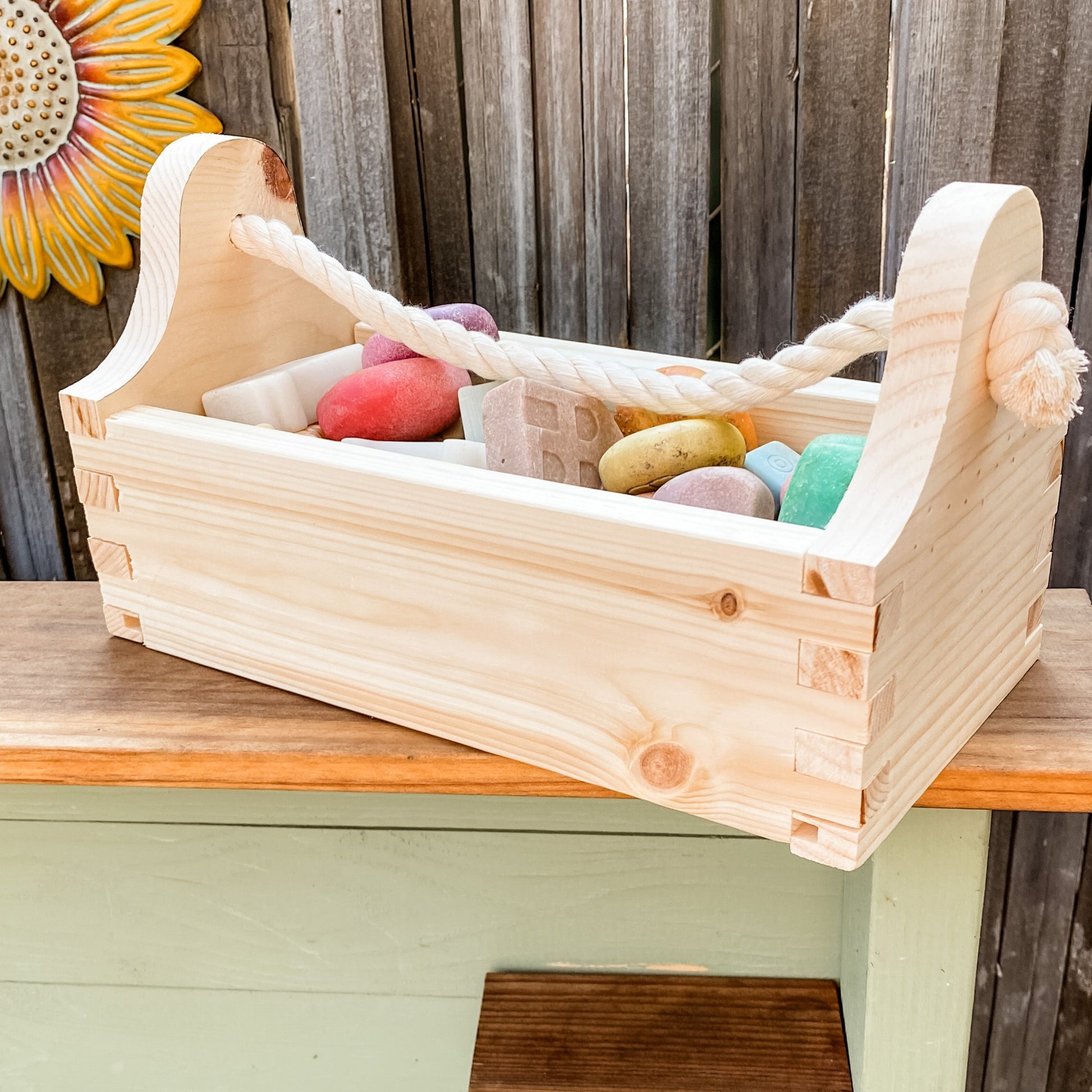Child-sized handmade wooden tote in natural unfinished pine or choose from our paint colors. Easy to carry with a cotton rope handle. Perfect for small hands that want to carry around their favorite toys, rocks, dirt, garden treasures, and anything else they can dream of! You can use it for play or toy storage. You can even plant right inside the box if you want! The options are endless!